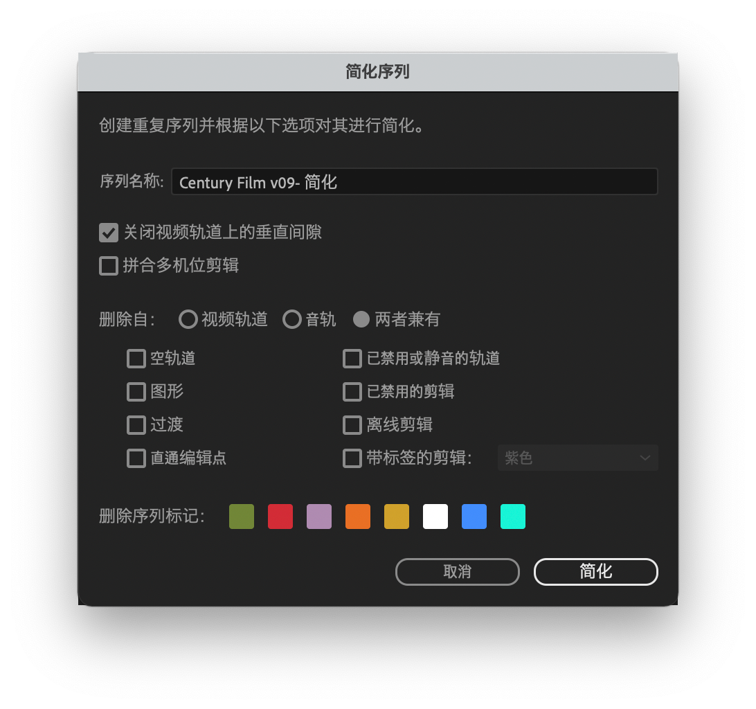 - Premiere Pro 会创建序列的副本,在简化序列对话框中,您可以选择序列副本中的不需要的元素。这些元素可以是空轨道、过渡、图形等。